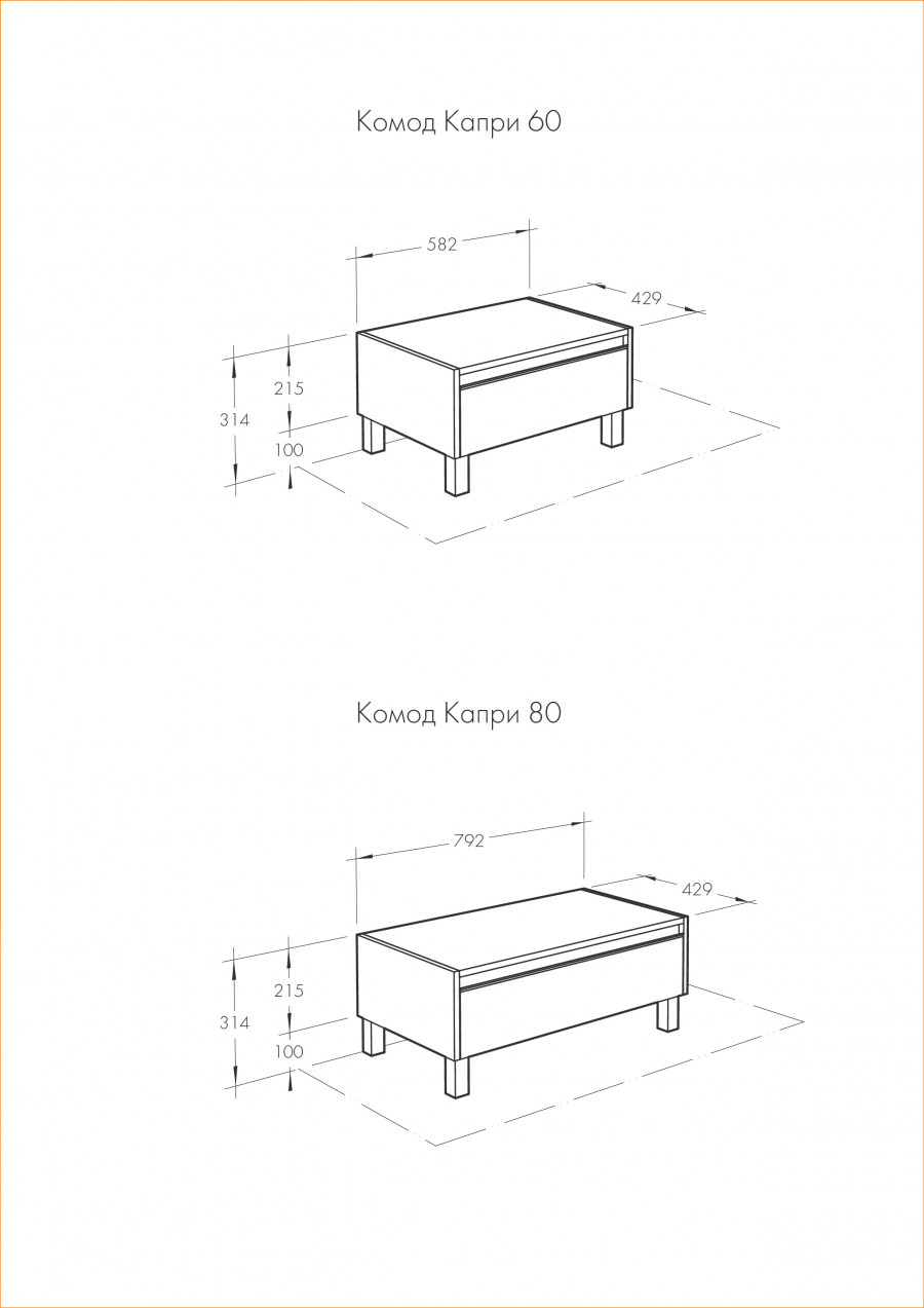 Комод на ножках прямоугольной формы, корпус с фасадами покрыты декоративной влагостойкой ЛДСП. В комплектацию входит: ящик - 1, крепеж к стене -2, ручка - 1, фасад - 1,направляющие с интегрированной системой плавного закрывания.