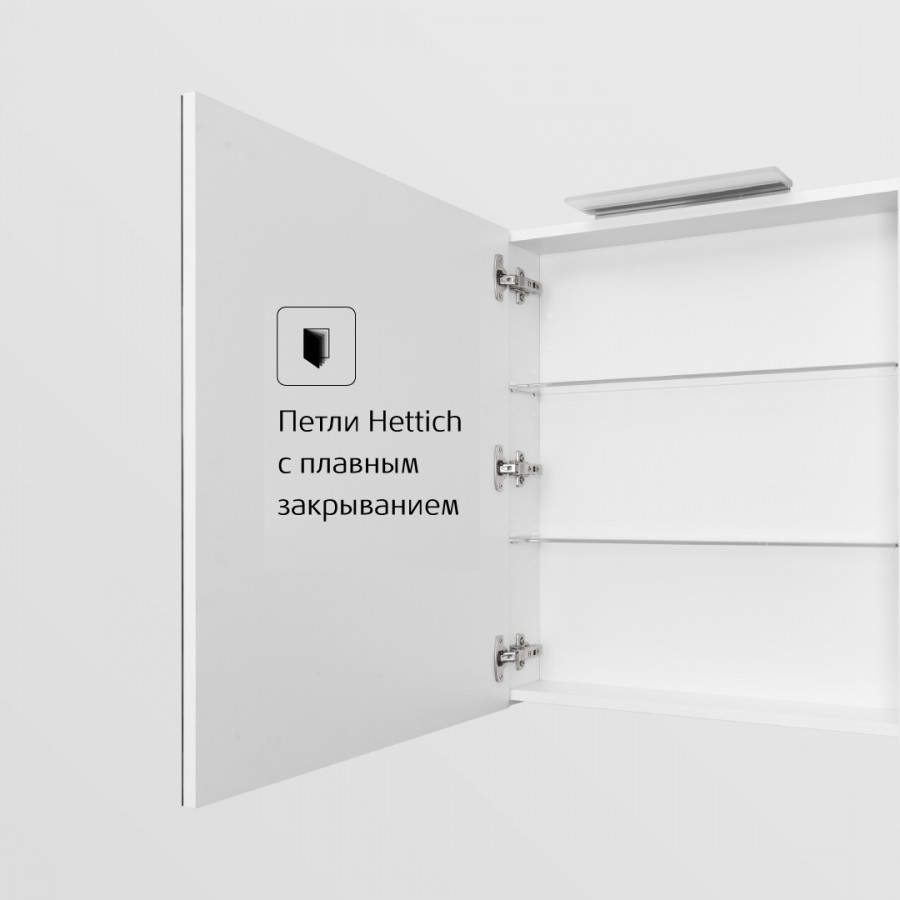 Зеркальный шкаф OLETA оснащен светильником от европейского бренда Ebir с возможностью регулировки положения, IP 44, 5 700 K. Теплота света у светильника 5 700 K – это яркий свет, идеальный для нанесения макияжа и бритья. Положение светильника можно регулировать: наклонить слегка вниз или направить свет повыше. За зеркальными фасадами расположены регулируемые по высоте полочки из просветленного стекла. Фасады оснащены петлями Hettich с плавным закрыванием. Внимание: началась замена артикулов с "7" на международный формат "A".