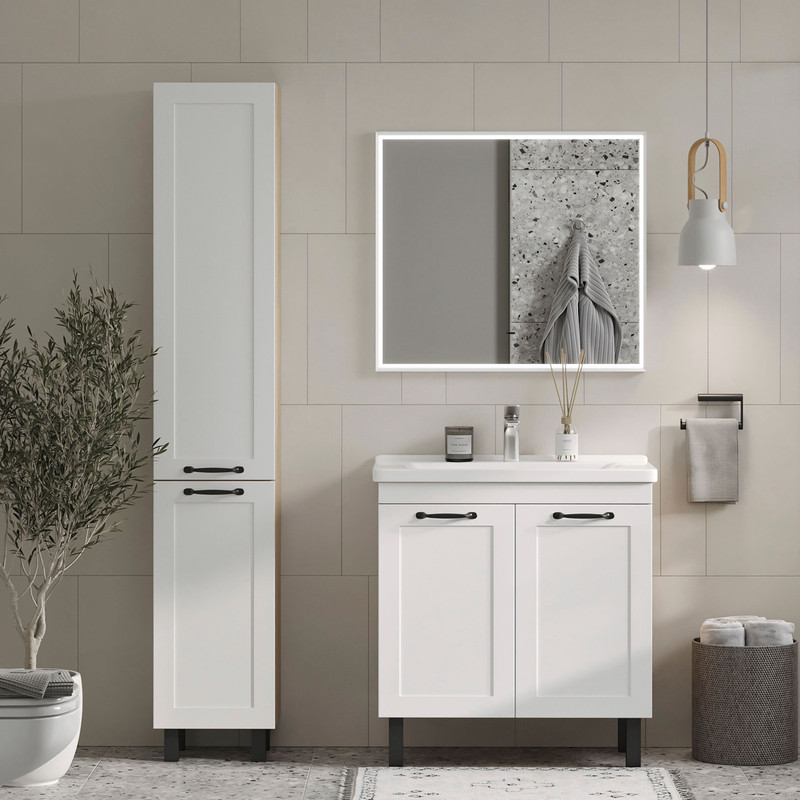 Напольный пенал с двумя стеклянными полками в верхней секции и одной полкой из ЛДСП в нижней секции. Дверки пенала открываются при помощи черных матовых ручек. Петли оснащены доводчиками для плавного закрывания. Фасады пенала изготовлены из МДФ и облицованы матовой пленкой ПВХ с эффектом «Soft Touch». Корпус изготовлен из влагостойкого ЛДСП. Пенал устанавливается на 4 ножки и фиксируется к стене при помощи креплений.