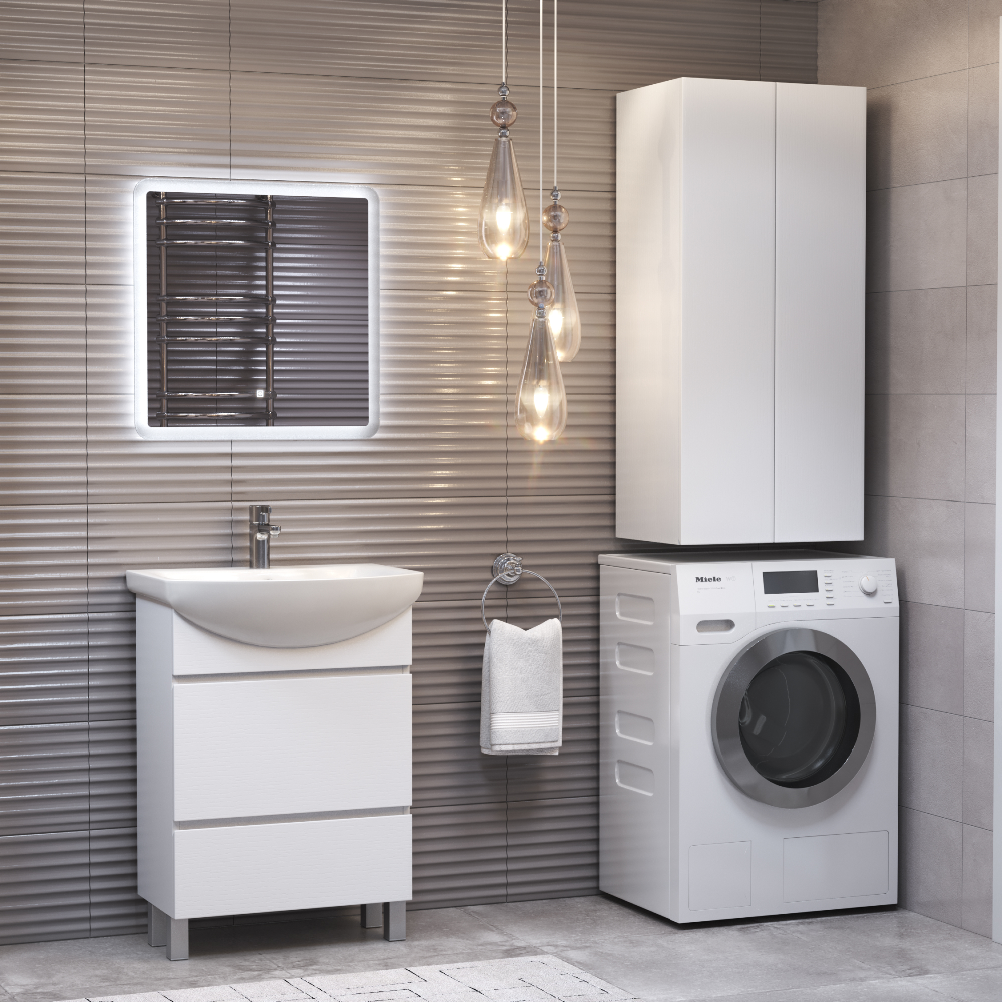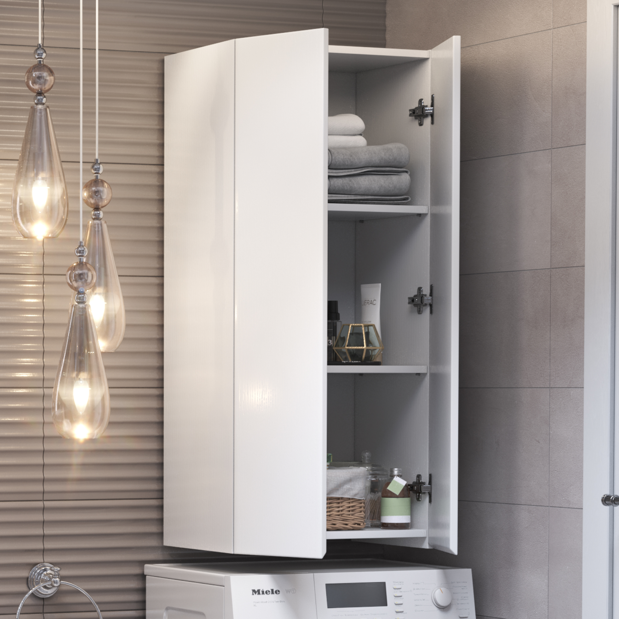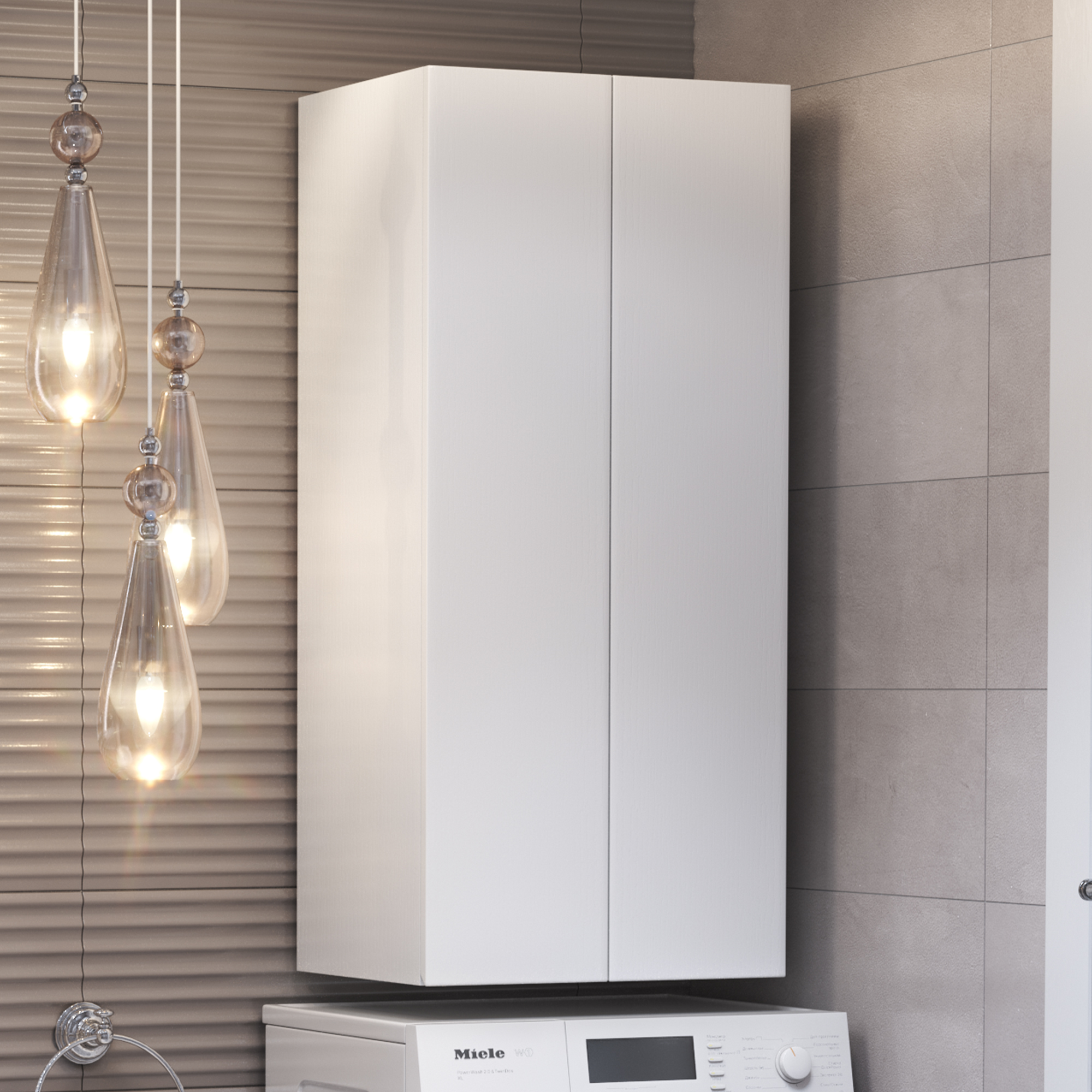 Шкафы Wing – идеальное решение, позволяющее сэкономить пространство ванной комнаты за счет размещения над стиральной машиной. Петли с доводчиком. Функциональная глубина полок 320мм. Декор материала "структура дерева".
