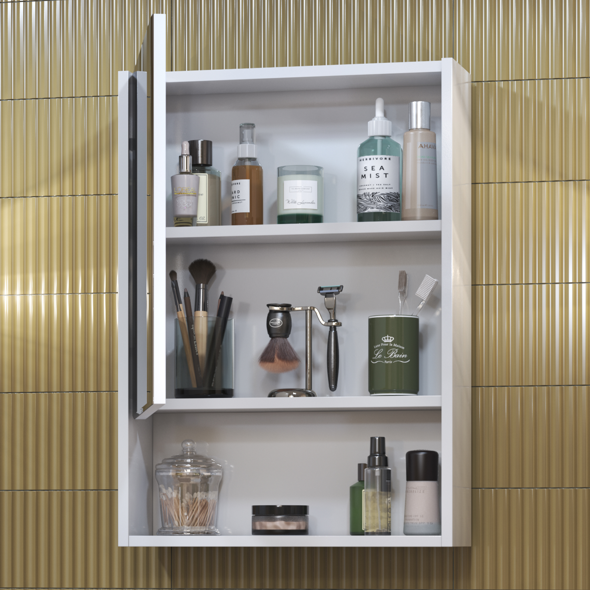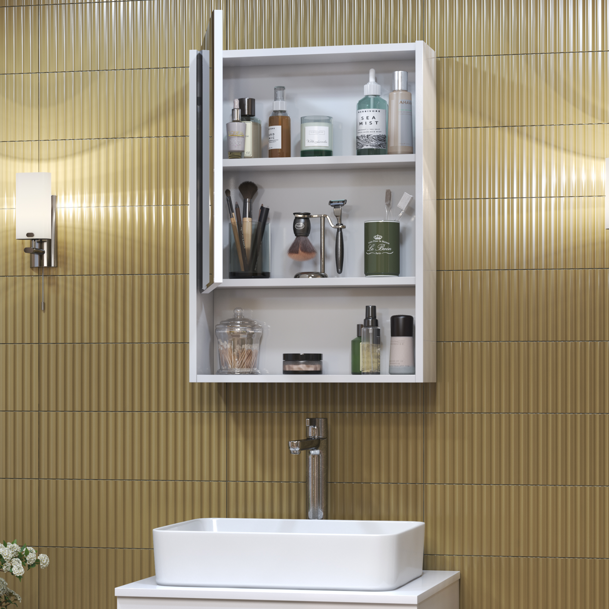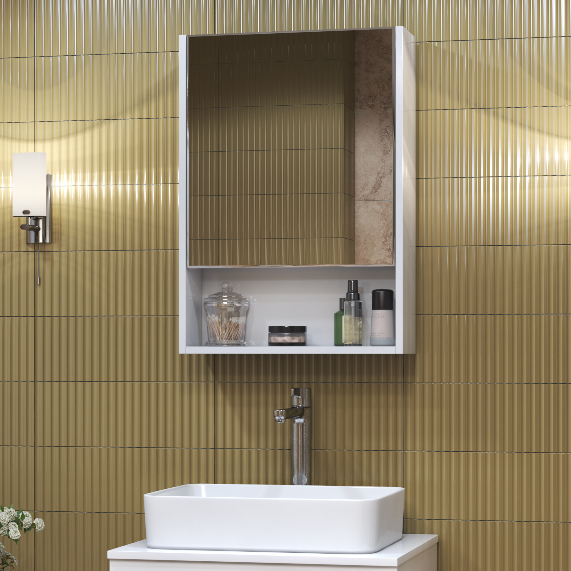 корпус шкафа, 1 дверца, петли с механизмом доводчика, зеркало с фацетом, 2 полки ЛДСП, 1 открытая полка снизу
