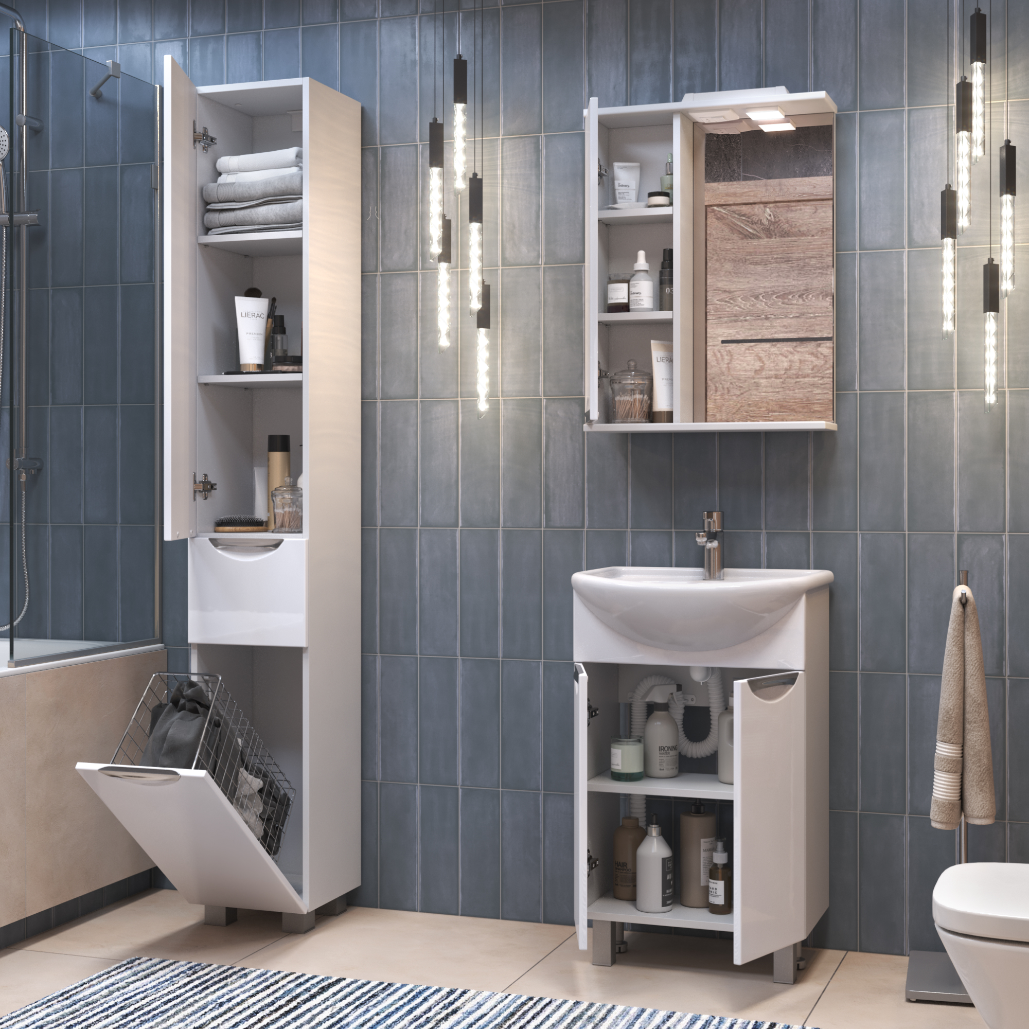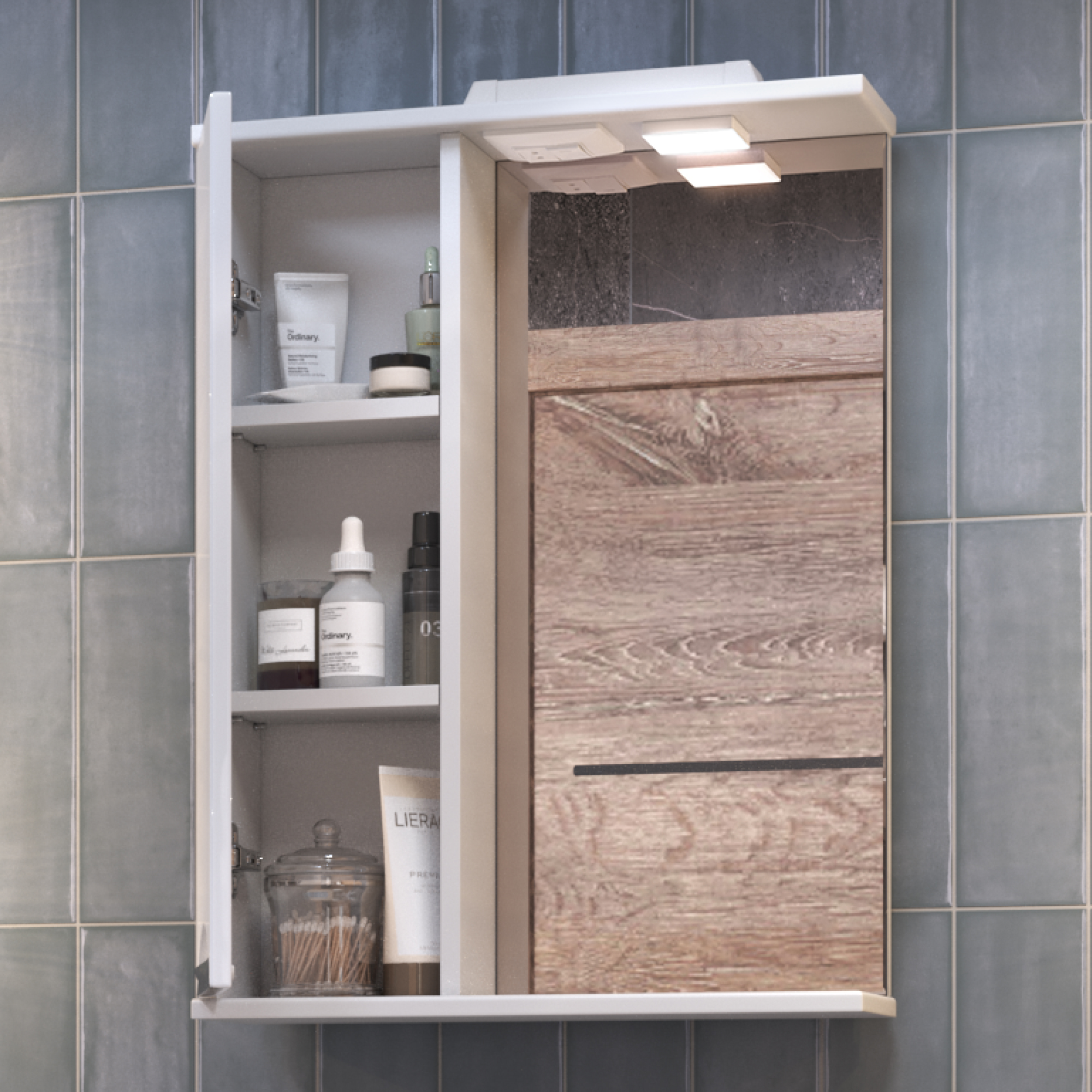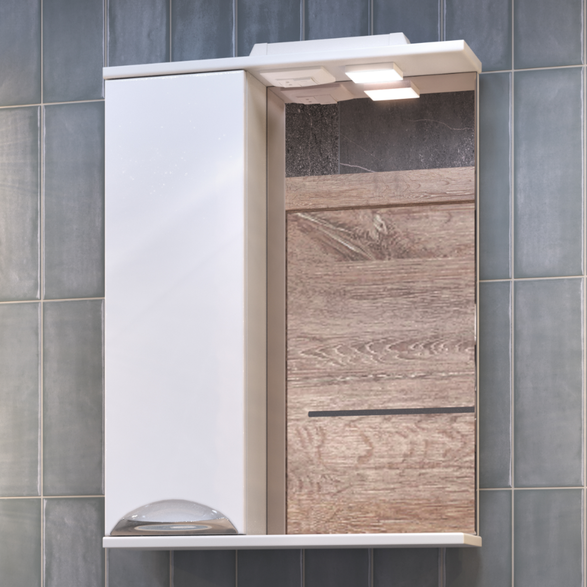 Левое/правое исполнение шкафчика; 2 полки ЛДСП; ручка металлическая хромированная; 1 светодиодный светильник, включатель с розеткой.