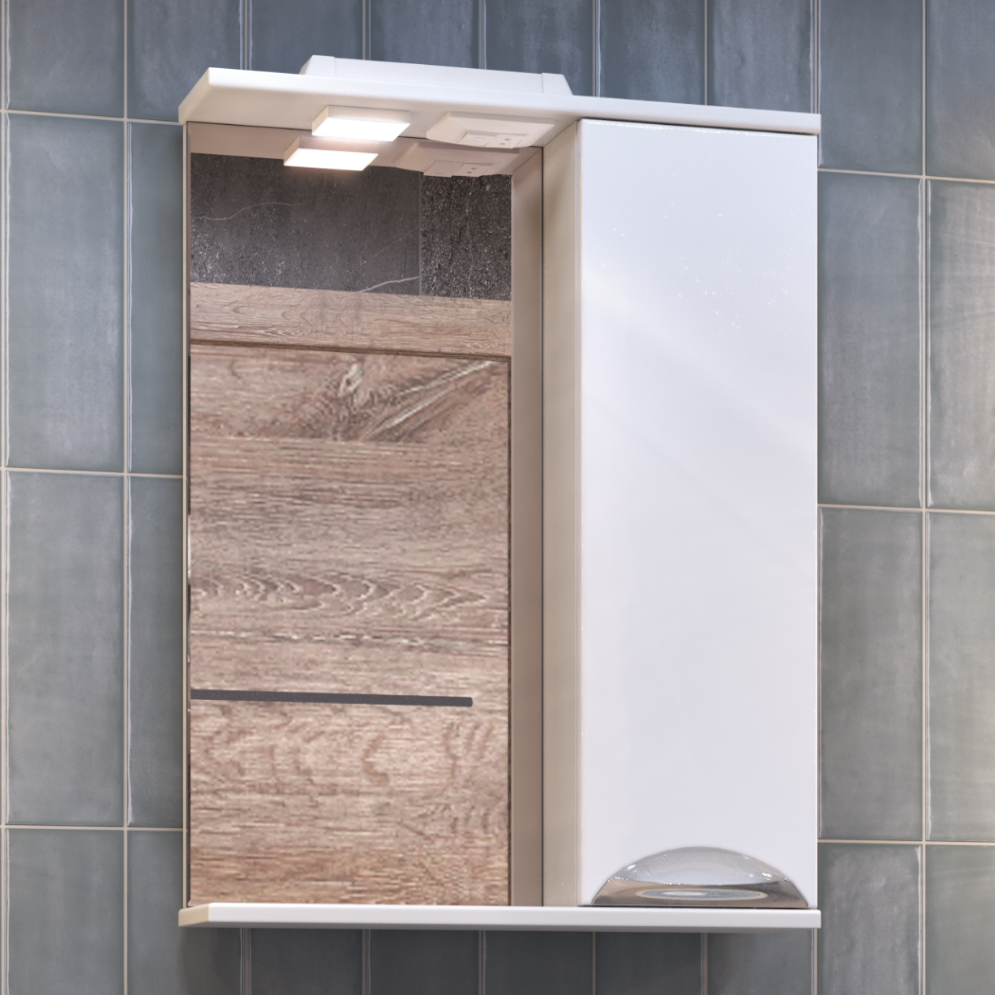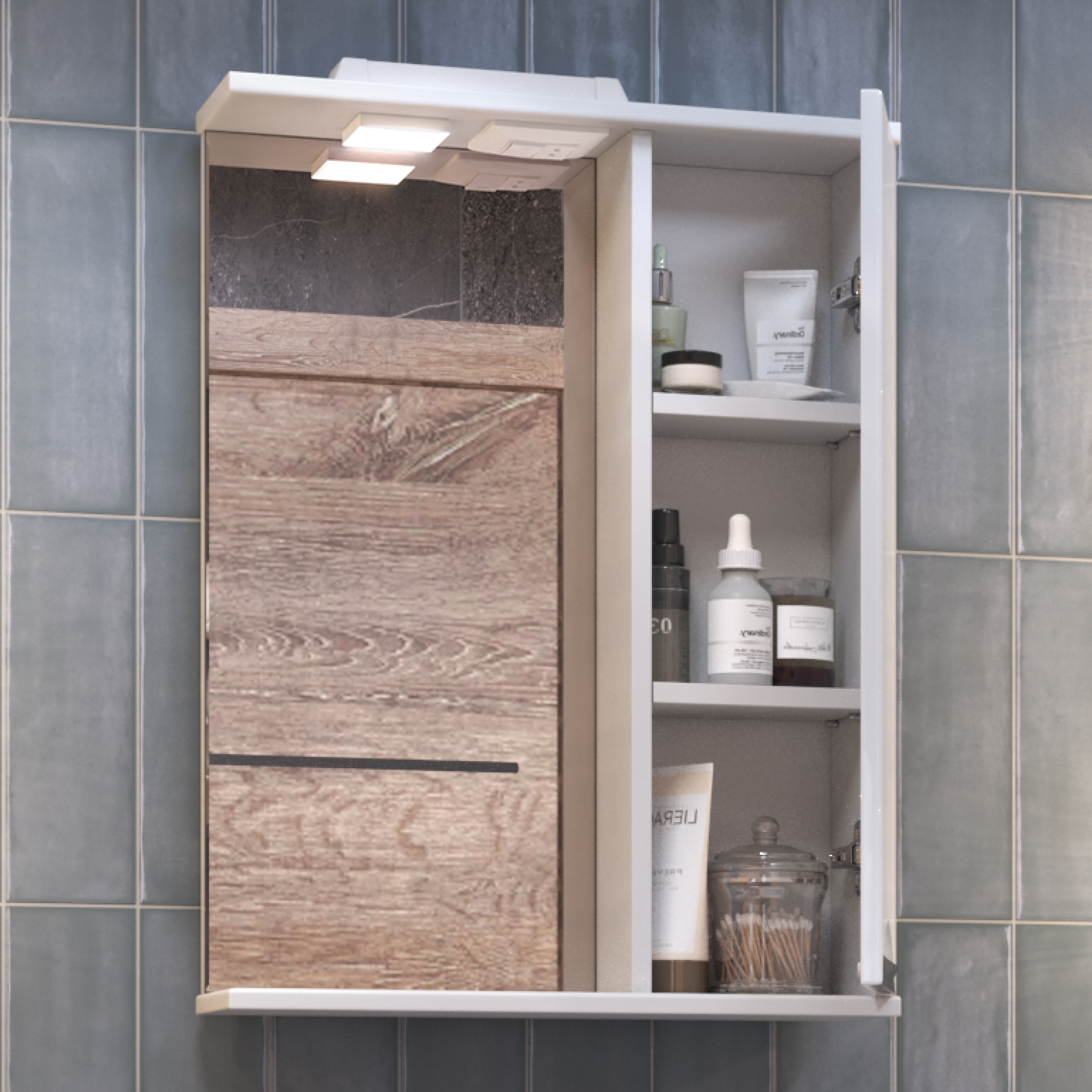 Левое/правое исполнение шкафчика; 2 полки ЛДСП; ручка металлическая хромированная; 1 светодиодный светильник, включатель с розеткой.