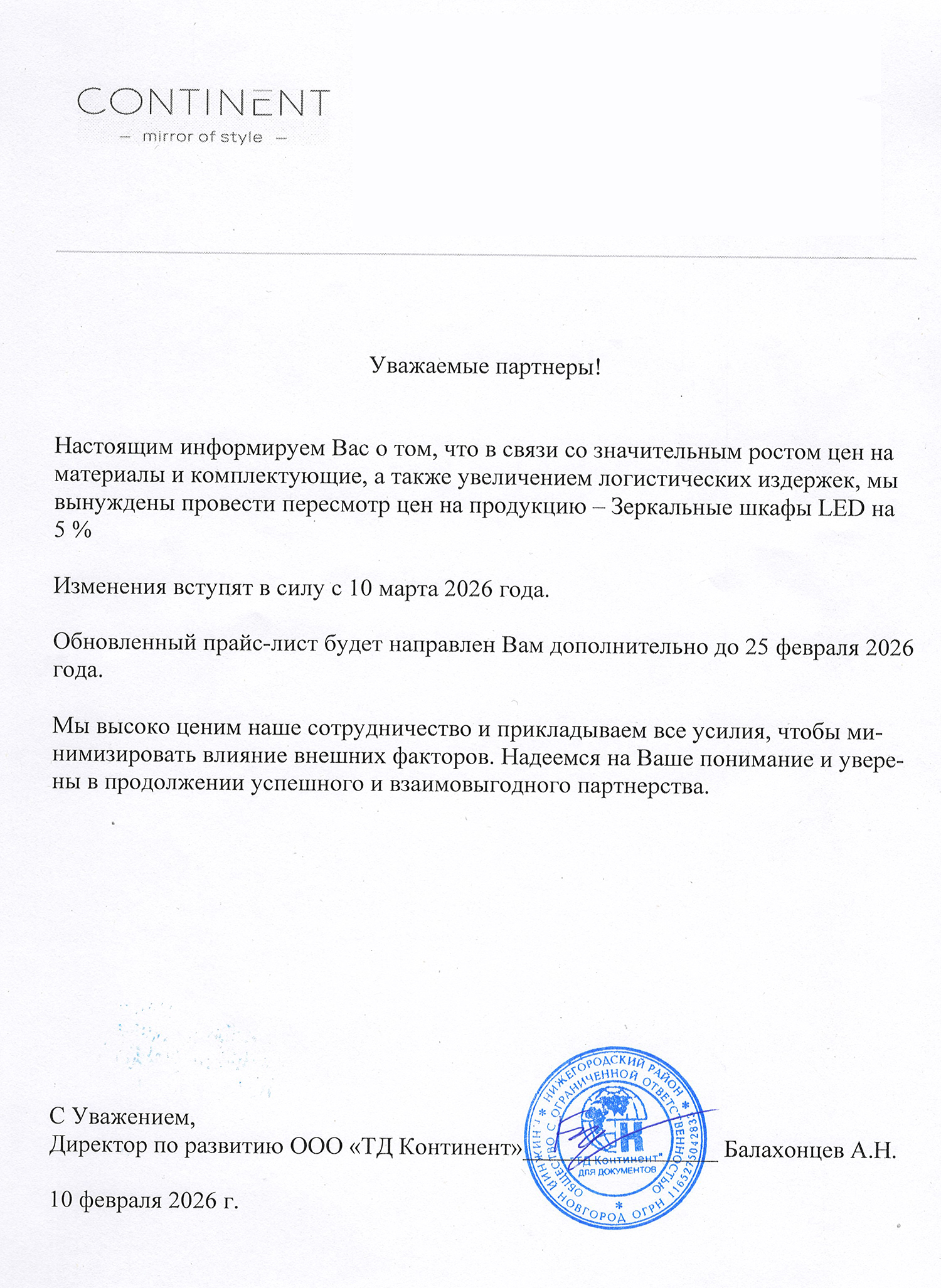 С 10 марта 2026 года ожидается повышение цен на зеркала с LED-подсветкой CONTINENT в среднем на 5%.