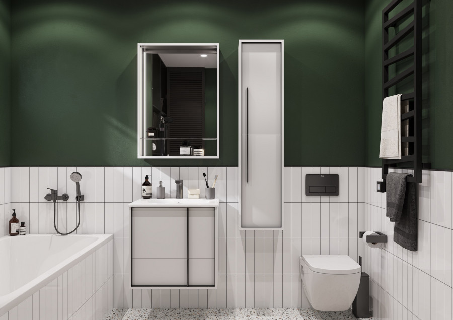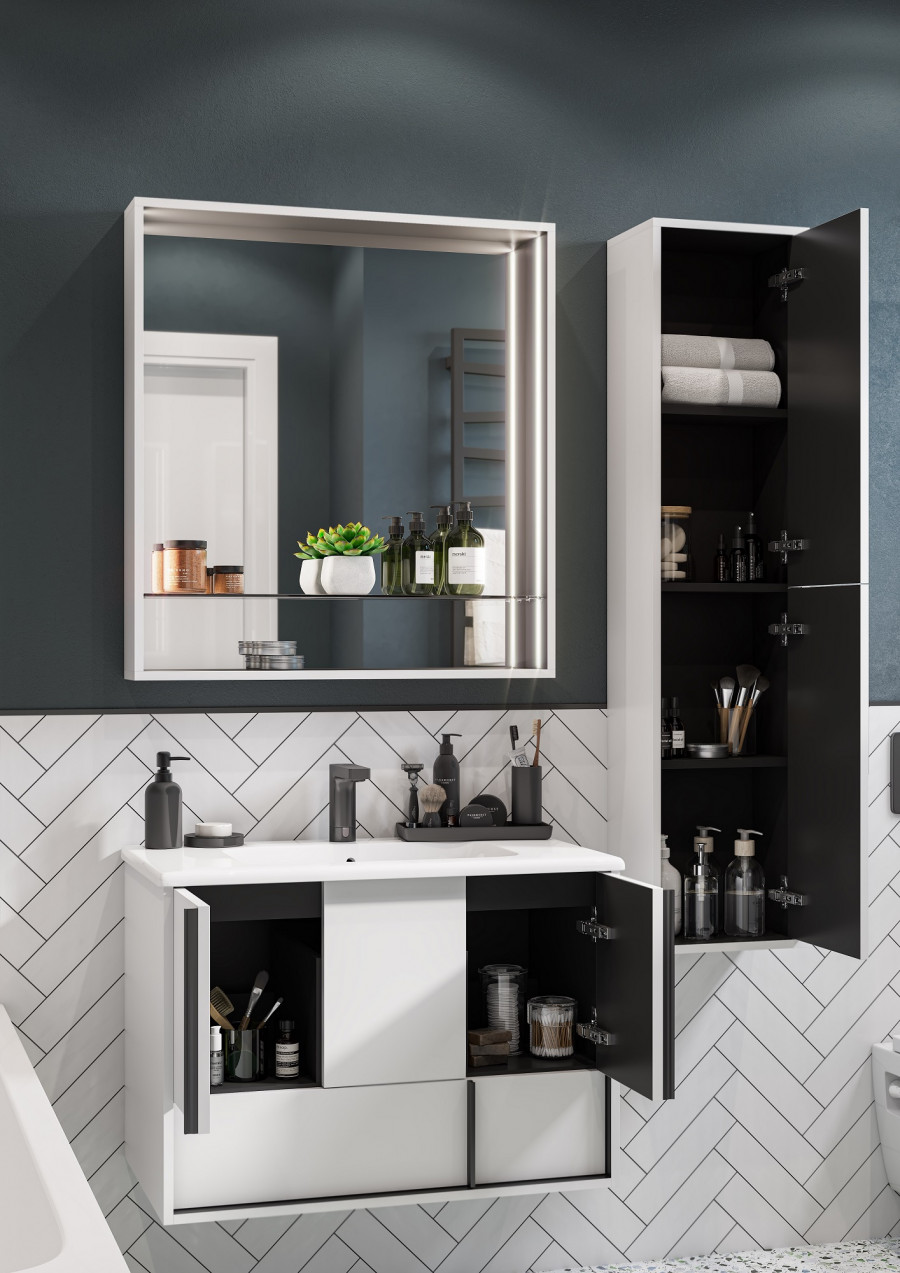 Корпус шкафа-колонны выполнен из черной МДФ в белой пленке, что позволяет создать яркий контраст черного и белого. Пленка позволяет надежно защитить мебель от воздействия влажной среды ванной комнаты. Необычные черные матовые ручки комфортны в использовании и подчеркивают четкую геометрию линий коллекции. За фасадами расположены регулируемые полки из влагостойкой ламинированной ДСП. Петли снабжены доводчиками для комфортного использования.