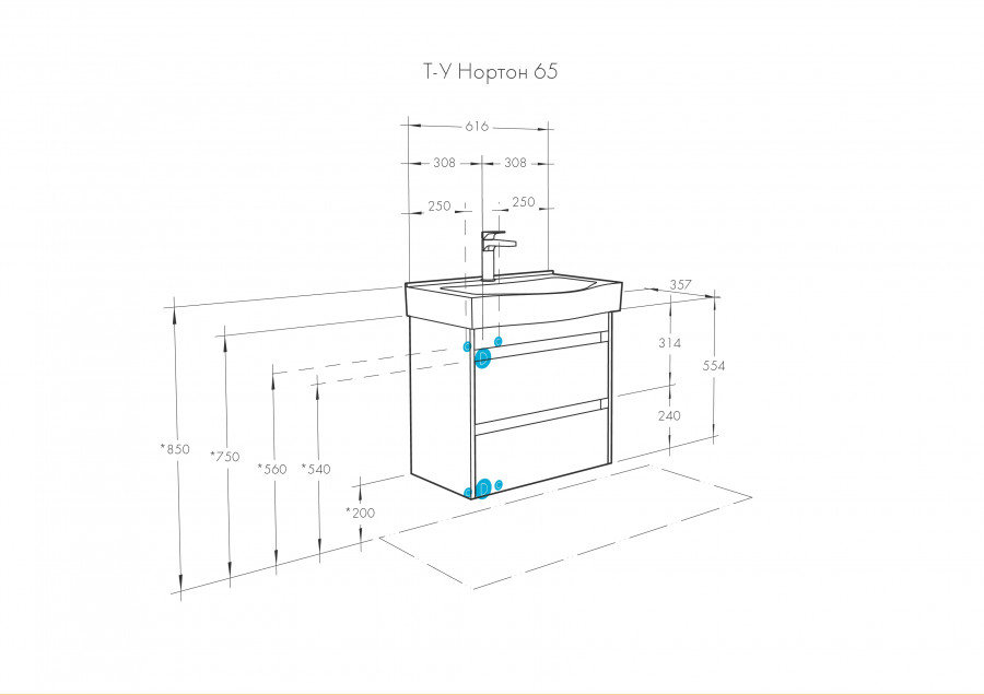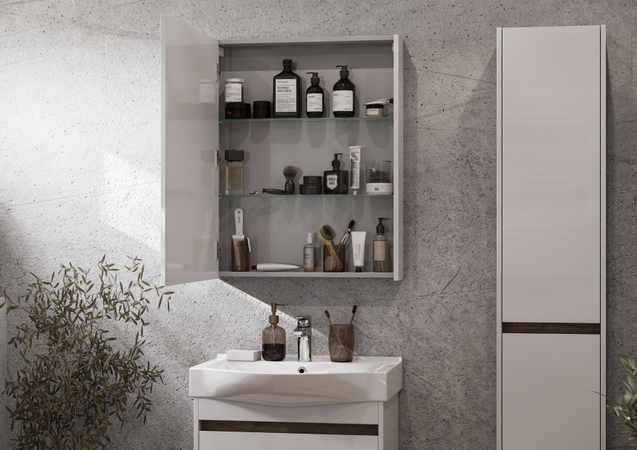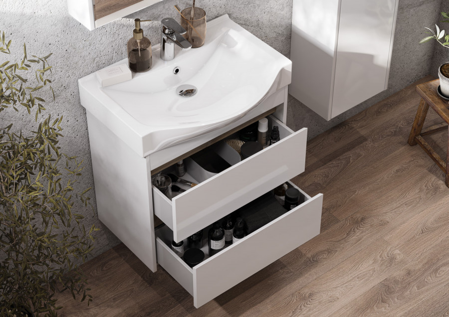 Тумба Нортон 65 в лаконичном дизайне универсальна для любого интерьера ванной комнаты. Корпус тумбы выполнен из влагостойкой ЛДСП, а фасады из МДФ в белой глянцевой покраске. Дизайн тумбы подчеркивает декоративная вставка из ЛДСП с фактурой натурального дерева дуб эндгрейн. Конструктивно тумба состоит из 2 вместительных ящиков, установленных на направляющие с доводчиками для комфортного использования. На тумбе нет выступающих деталей и фурнитуры, открытие ящиков реализовано за счет удобного выреза на фасаде. Тумба комплектуется белоснежной раковиной Беверли от бренда Santek. Тумбу можно использовать в двух вариантах: подвесную или дополнительно приобрести опоры 1A222703SI000.