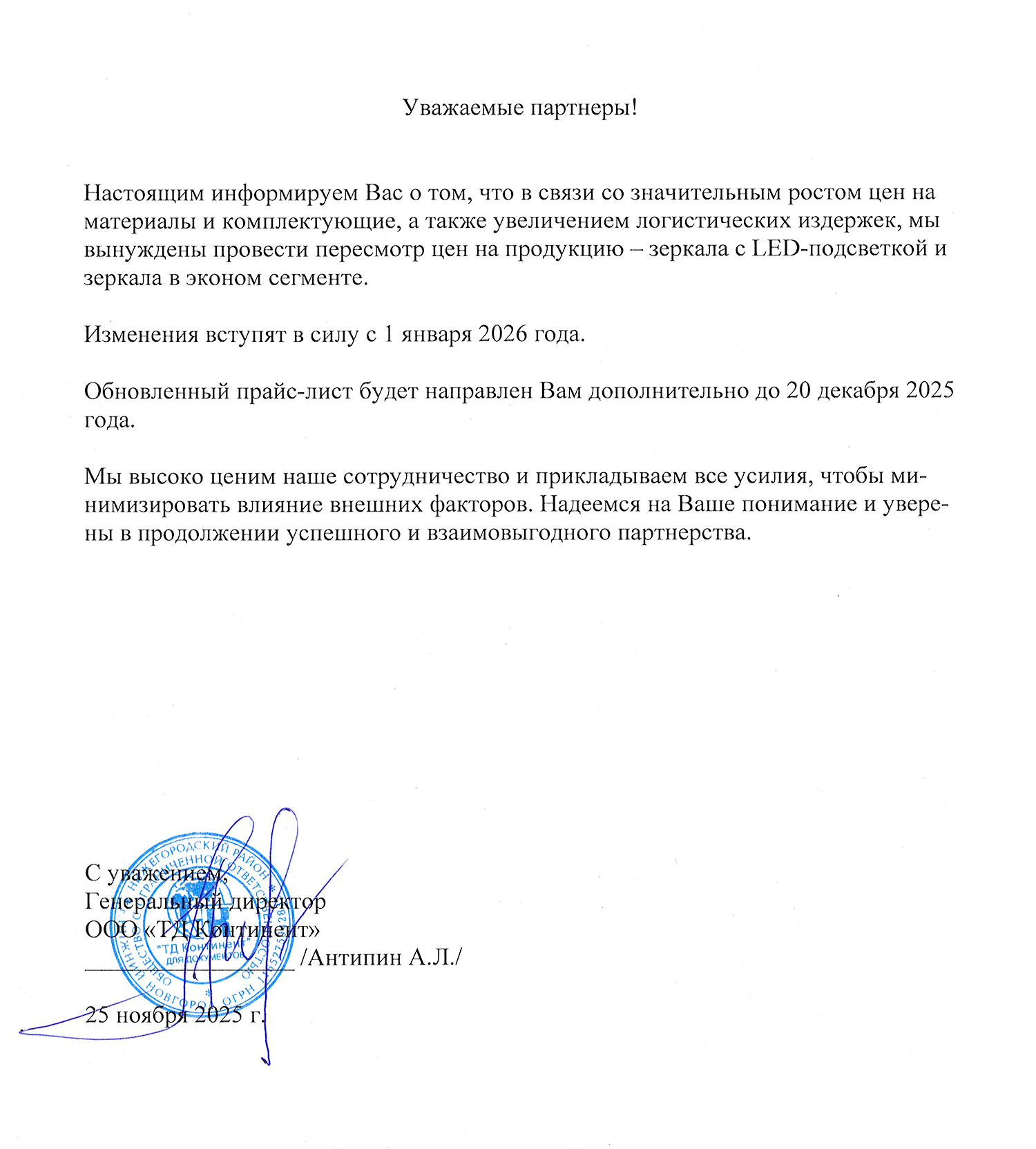Информационное письмо о повышении цен во вложении.
